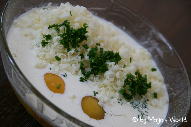 Eier mit Sahne,Schnittlauch,Käse,Salz und Pfeffer vermischen und über die Kartoffelscheiben gießen.