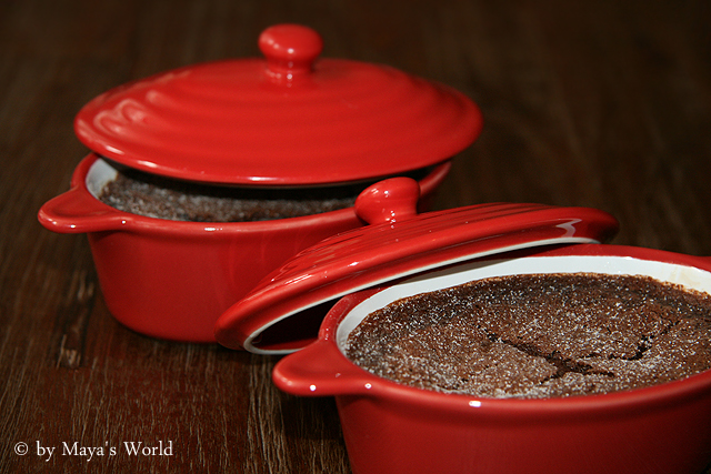 Se amesteca faina cu cacaoa într-un castron si se adauga cîte o lingura la amestec.Se unge cu unt o forma termorezistenta(capacitate 1 L ) sau 4 forme micute.Se toarna amestecul în forme si se coace în cuptorul preîncalzit la 170°C 30-35 de minute.